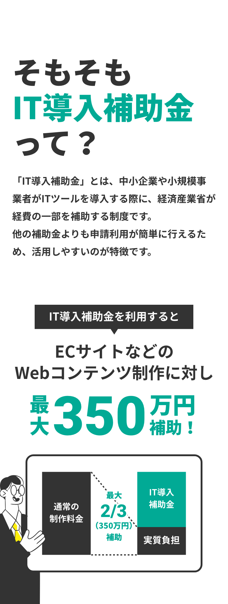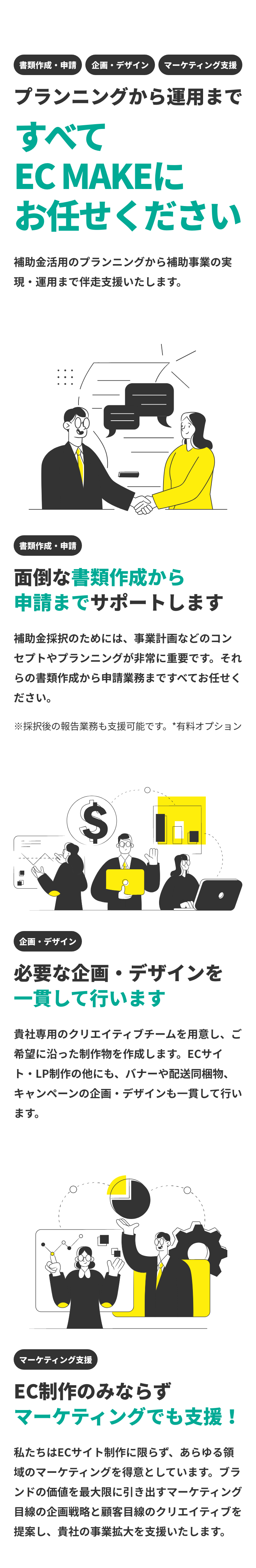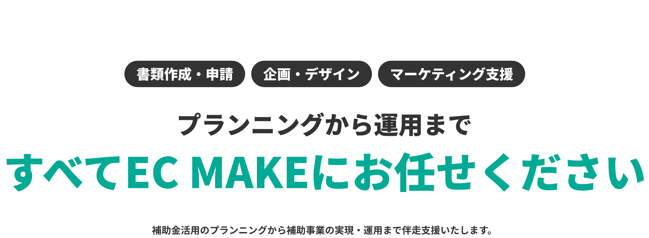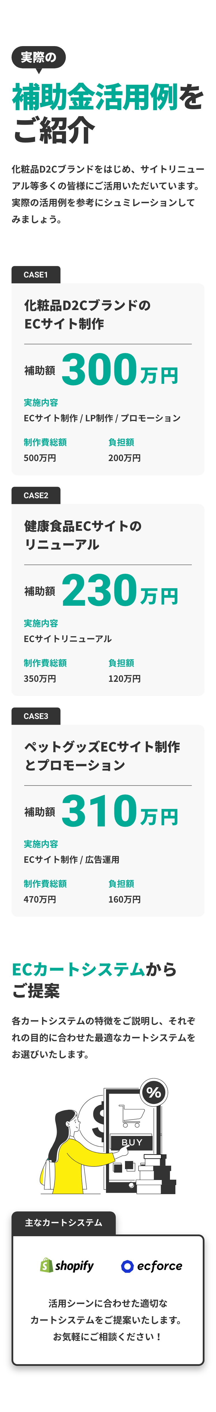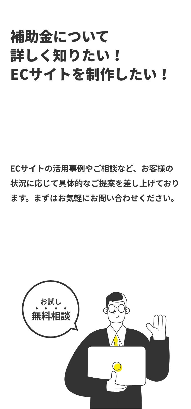 - ECサイト以外の通常のウェブサイトやランディングページ制作でも補助対象にすることが可能です。詳しくはご相談ください。